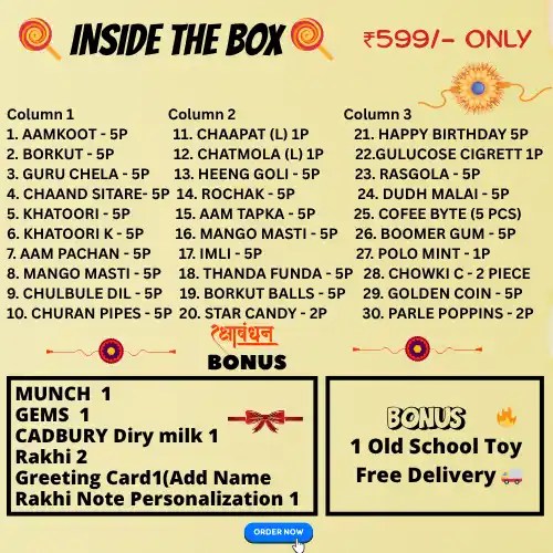 The Candywala 90s Rakhi Box is packed with iconic candies, desi snacks, childhood toys, chocolates, and a heartfelt greeting option β perfect for both brothers and sisters who grew up in the golden era of Indian childhood.